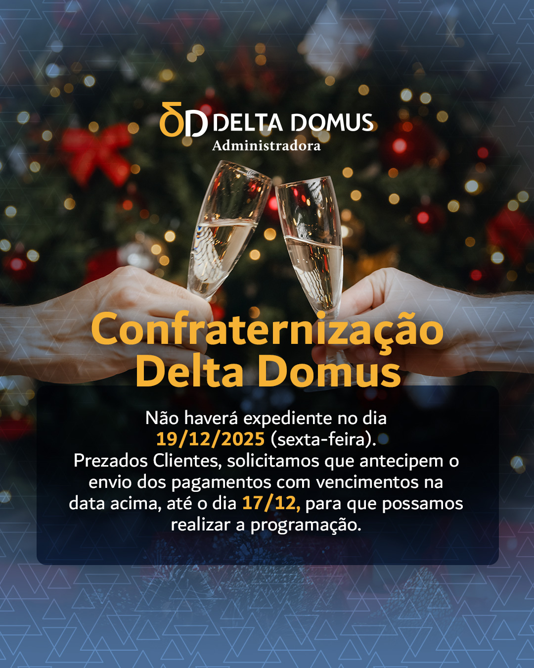Prezados Clientes, devido à festa de confraternização da equipe, não haverá expediente na Delta Domus no dia 19/12/2025 (sexta-feira).
