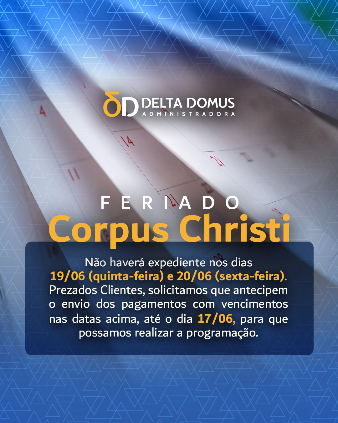 Prezados Clientes, informamos que não haverá expediente na Delta Domus nos dias 19/06 (quinta-feira) e 20/06 (sexta-feira) devido ao feriado de Corpus Christi.