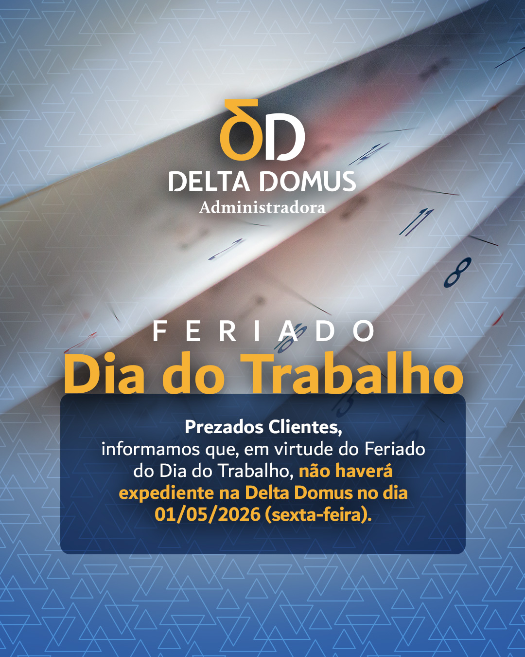 Prezados Clientes, informamos que, em virtude do Feriado do Dia do Trabalho, não haverá expediente na Delta Domus no dia 01/05/2026 (sexta-feira).
